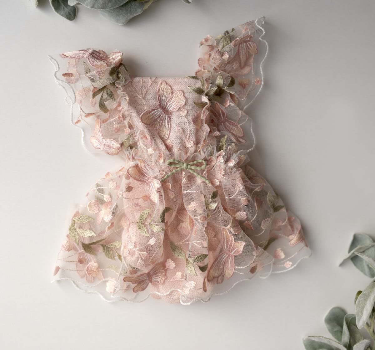An adorable romper made of a cute lace fabric with floral and butterfly designs. Tied at the back with tulle ribbons.
