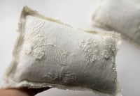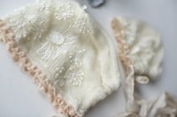 A cute bonnet made of a very delicate textured floral fabric. Matching pillow also available. An essential!